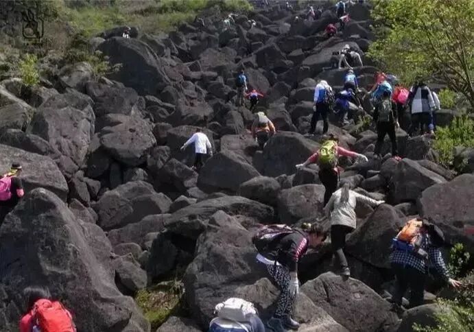 万年石浪:大大小小的褐色的石头源源不断从山顶倒下,神奇的是这些石头相互挤压的都很牢固,特别适合大家伙腾,挪,跳,越着从石浪群往山上赶。这就是传说中的”世纪冰川“了”。