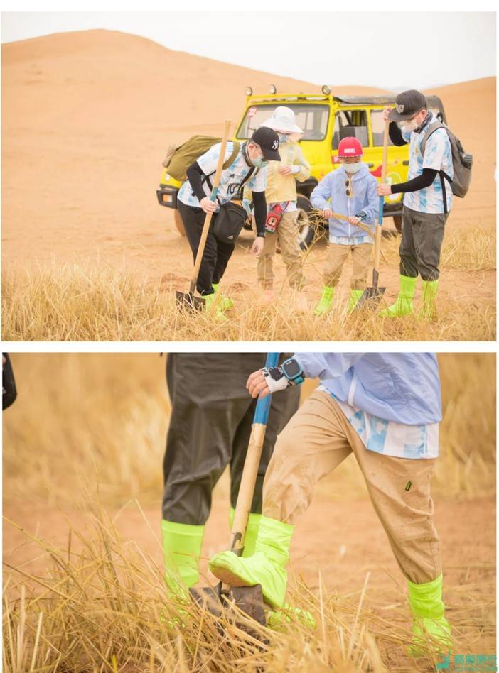 02:带领小朋友开扎麦草方格,麦草方格是目前为止全球治理沙漠最好的方式之一,方格将会把沙漠固定住不再随意流动,而草籽掉落在方格中更容易存活。