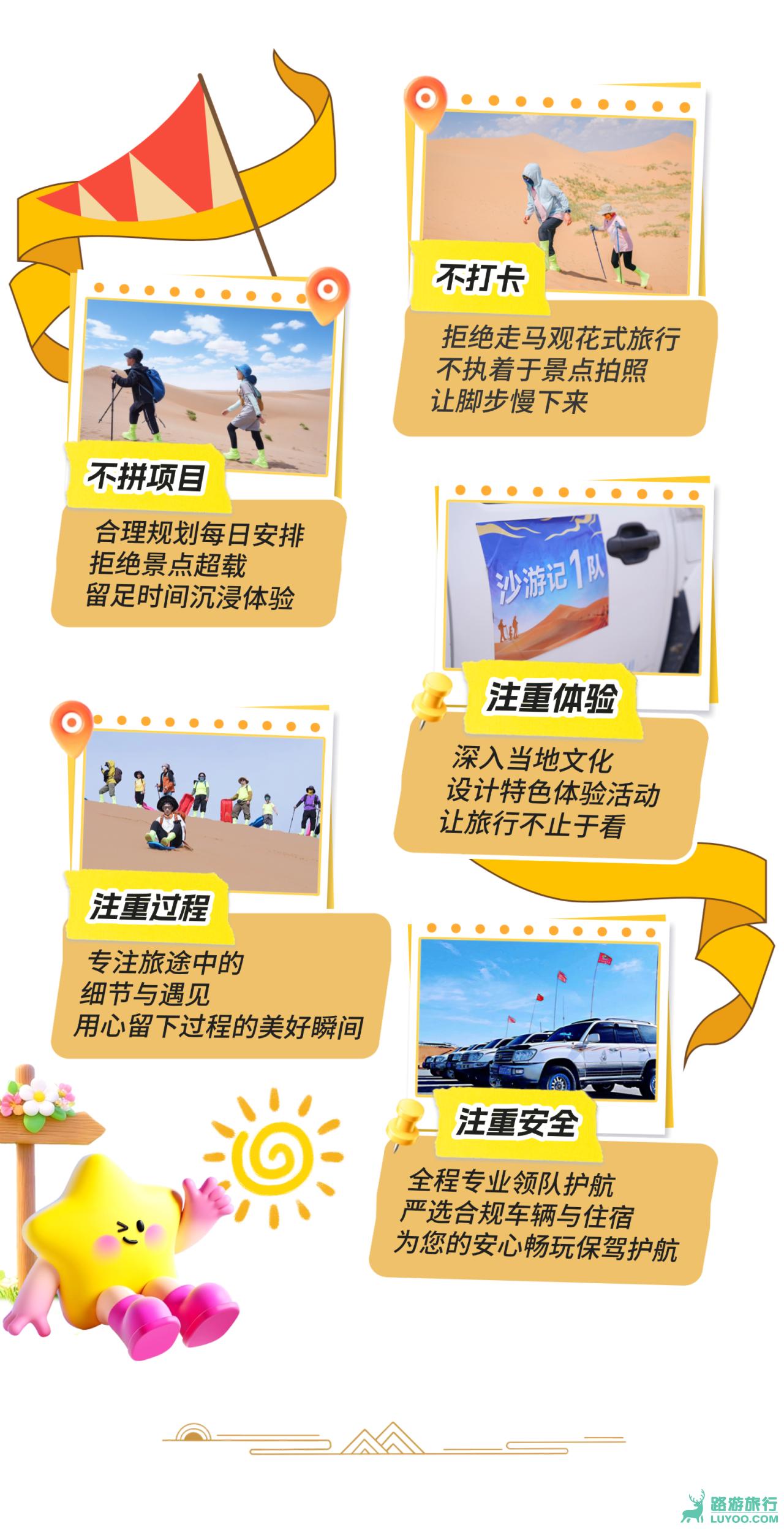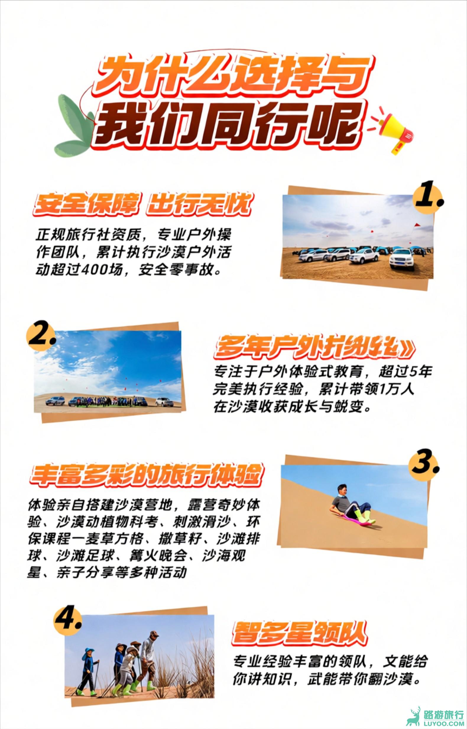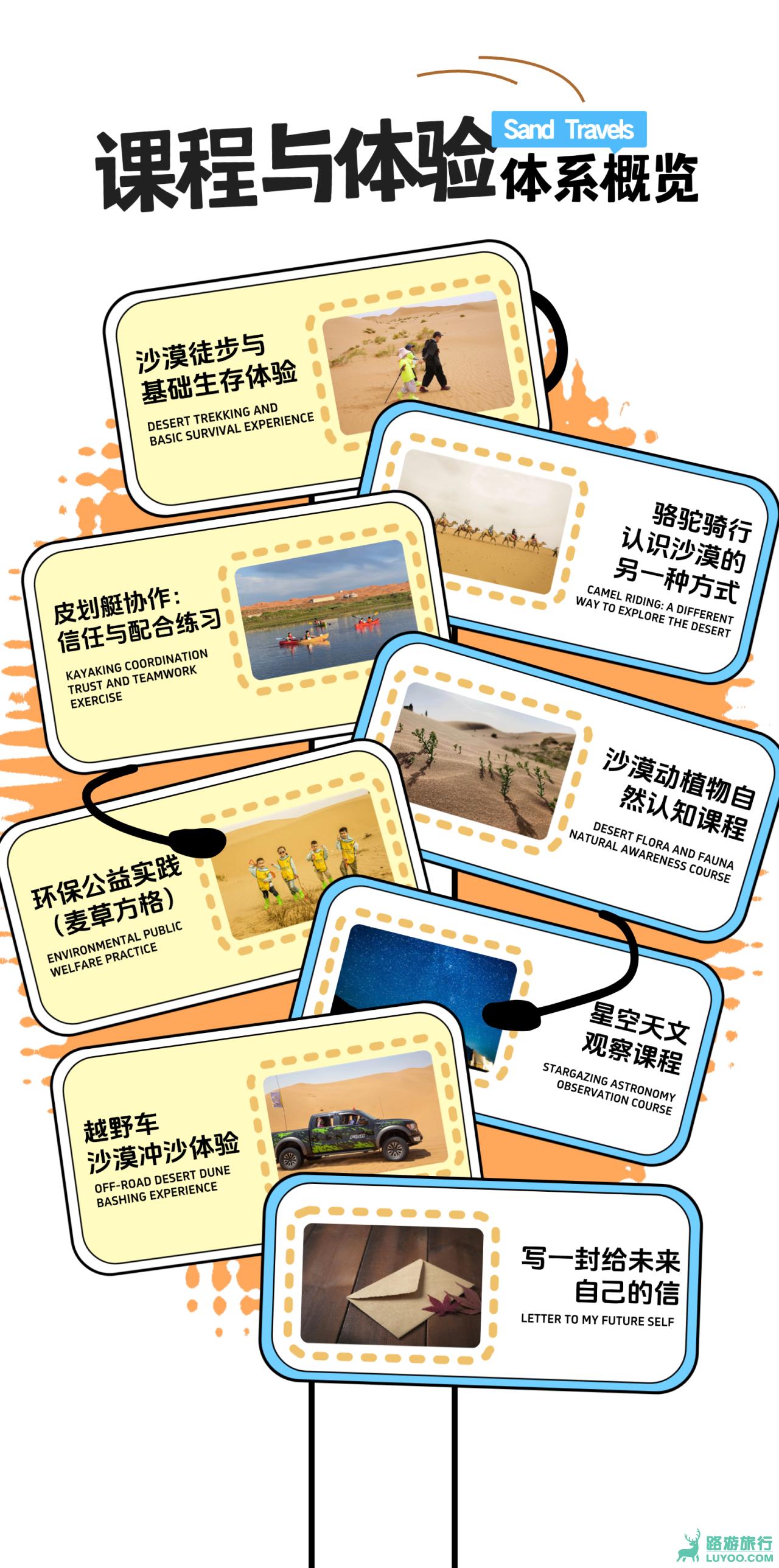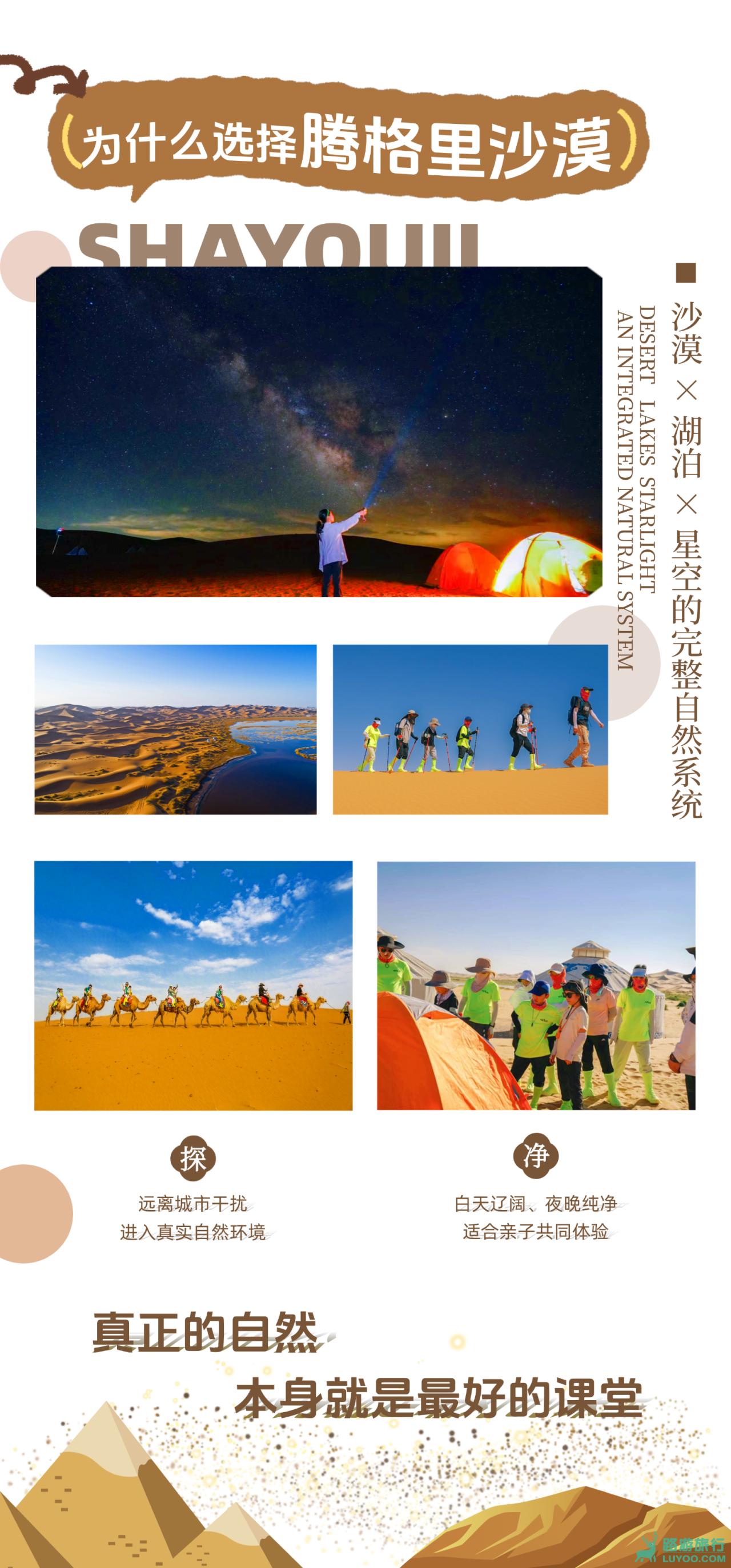 4、活动与课程:行程所列所有核心体验项目,包括沙漠徒步指导、皮划艇协作、骆驼骑行体验、麦草方格治沙实践、专业星空观测课程、越野车冲沙、滑沙体验等(具体执行按当天营地安排为准)。