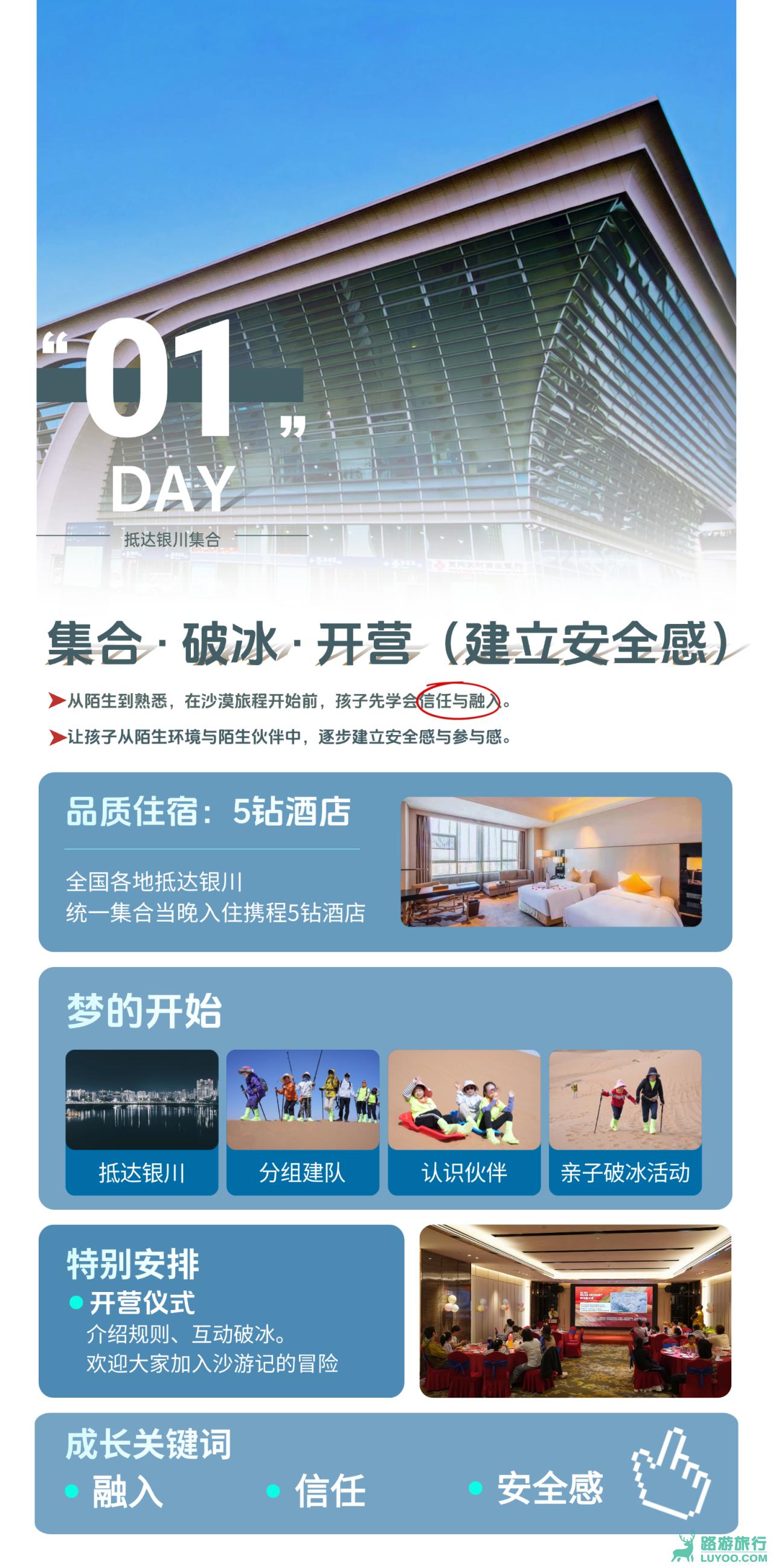 今日目标:从抵达银川的陌生,到破冰相识的熟悉,帮助每个家庭快速建立安全感与团队参与感。通过分组、讲解营规与安全须知,让孩子们安心、期待地开启沙漠之旅。