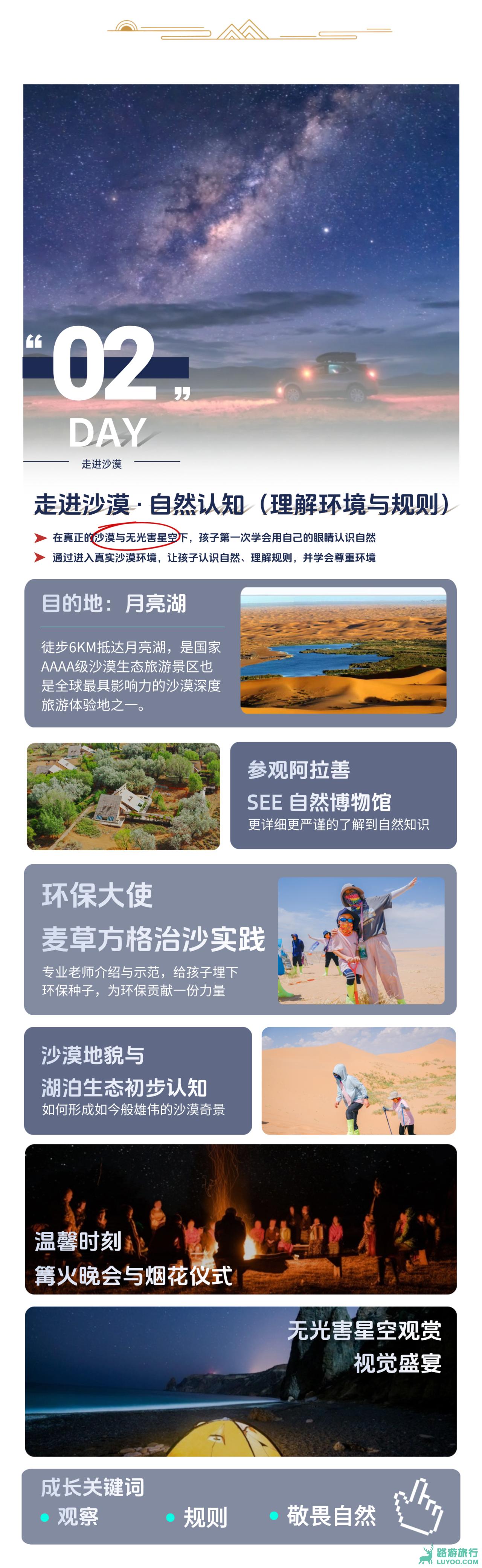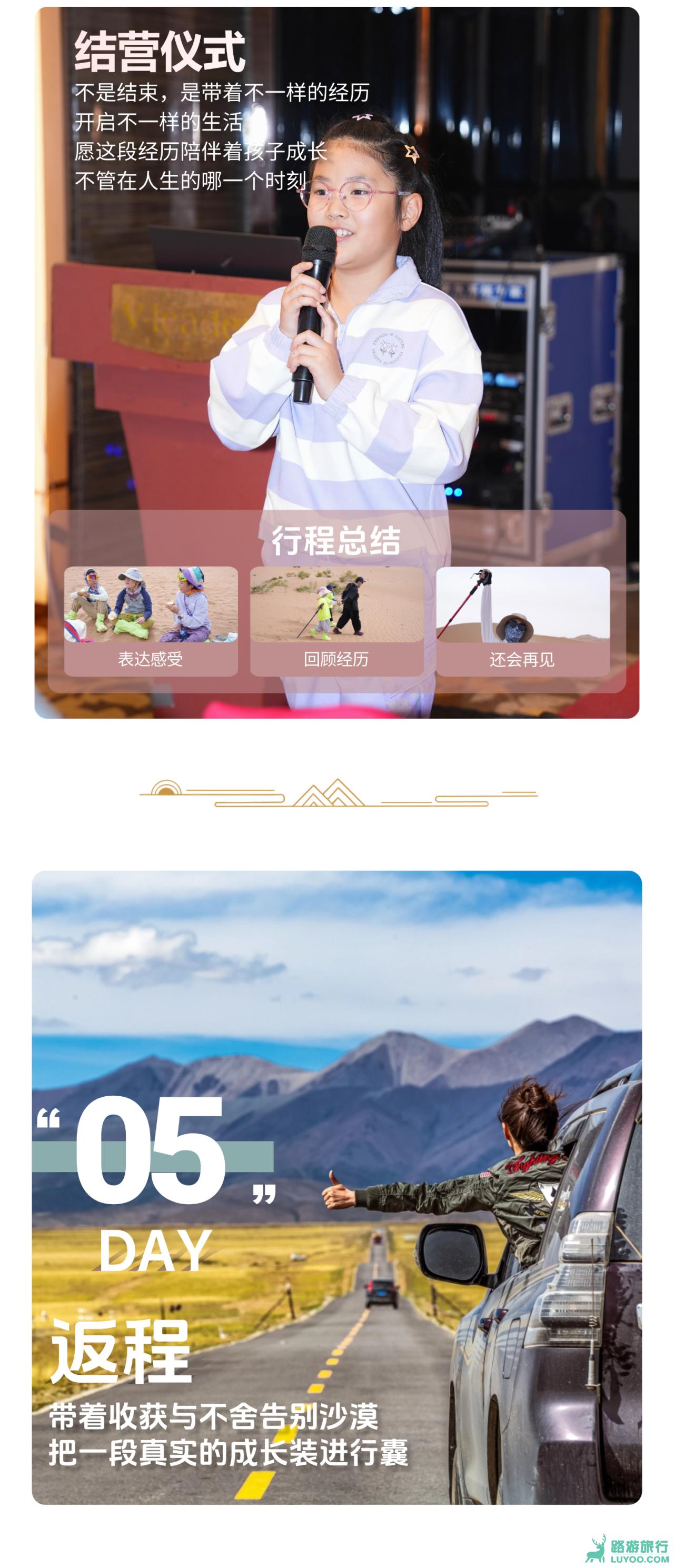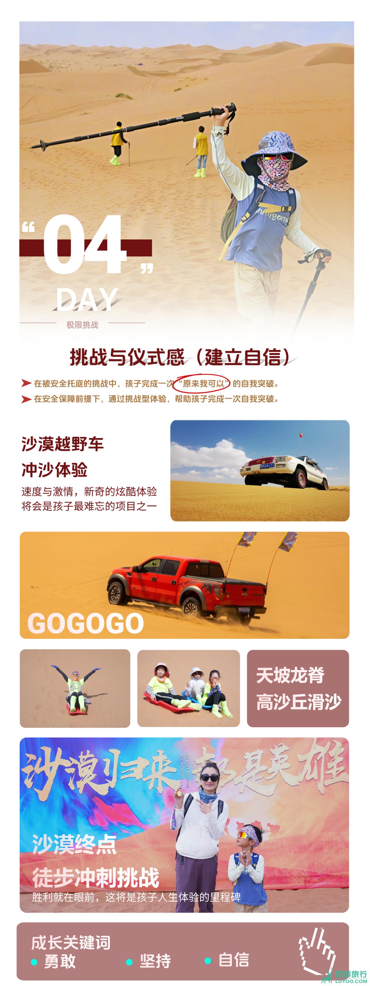 今日在安全规范的充分保障下,完成最后的挑战与突破。通过越野车冲沙与滑沙体验勇气与快乐;完成最后5KM的沙漠冲刺,将“我可以”的信念化为脚下的每一步;在闭营仪式中回顾旅程,将收获与荣耀正式封存。