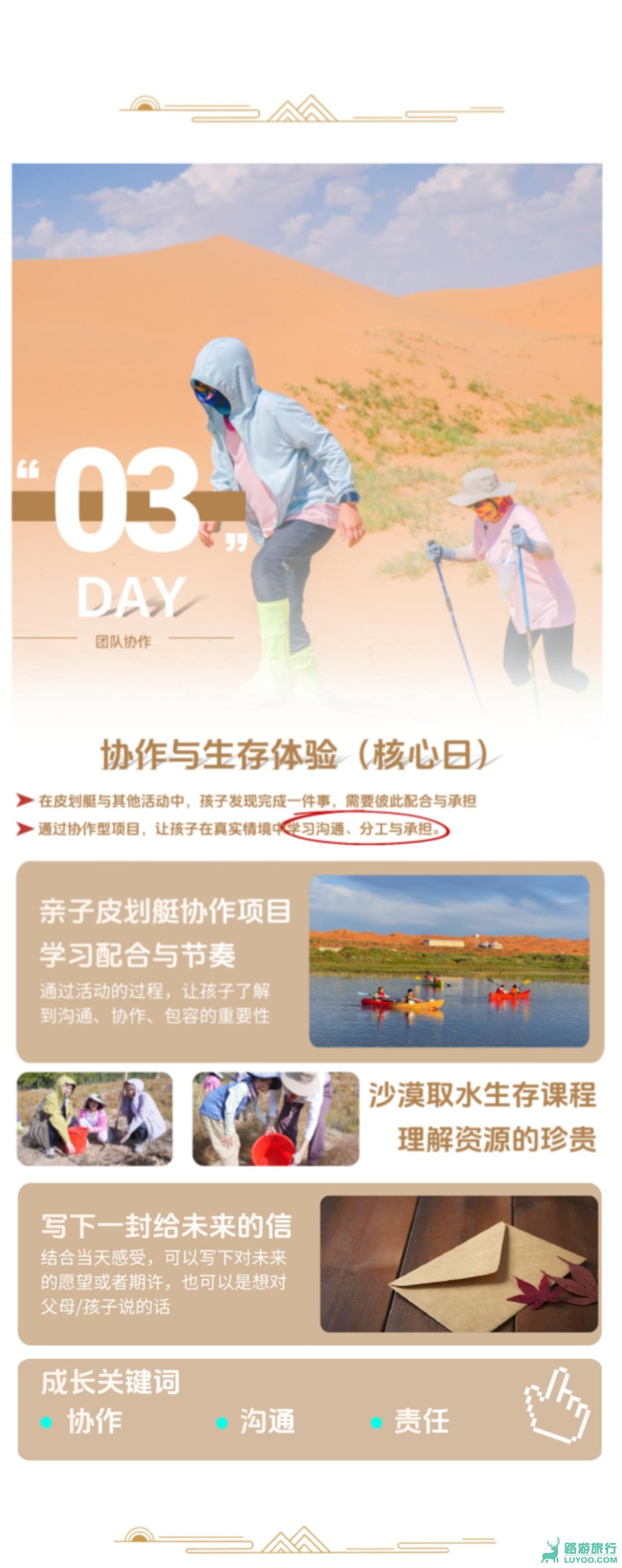 亲子皮划艇协作:在领队指导下,学习皮划艇基本操作,亲子搭档完成一段水上划行与协作任务生存体验课程:学习在极端环境下如何寻找水源、利用资源,培养资源珍贵意识与团队分工精神团队。
