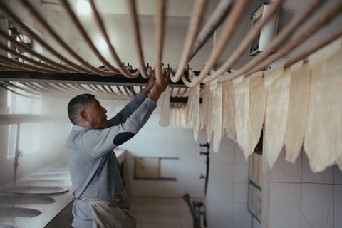 曾是历朝历代的皇家贡品,这就是享有盛名的东坞山豆腐皮,这张“金衣”已经流传千年。如今,它是浙江省非物质文化遗产项目,拿到过中国国际食品博览会金奖。