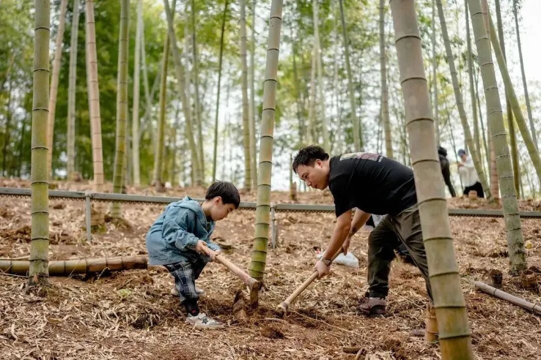这不仅是一次挖笋的体验,更是一次亲子间的深度互动。大手拉小手,一起拿起小锄头,学习如何辨别竹笋的生长位置,体验破土而出的喜悦。